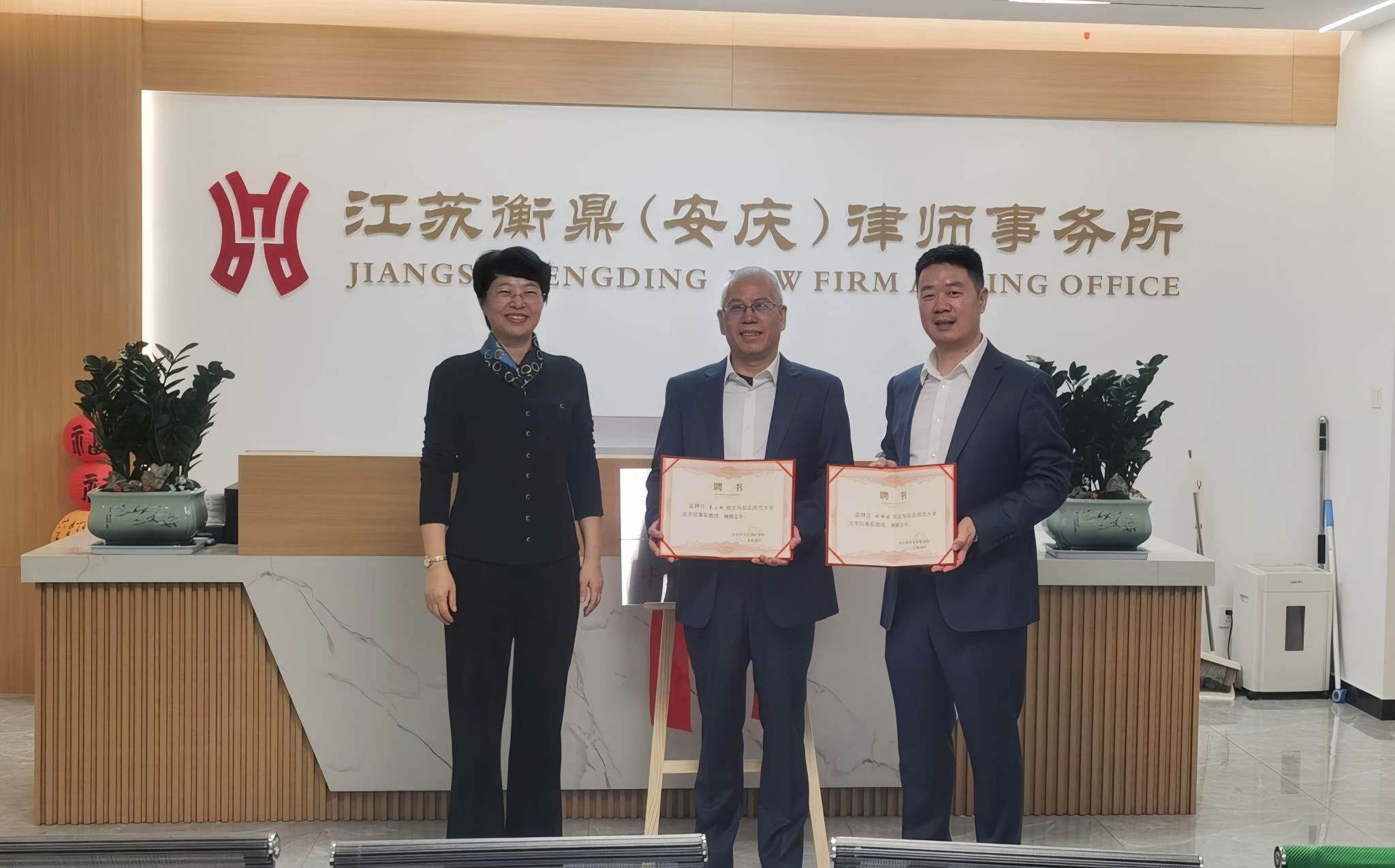 会上,衡鼎律所向安庆师范大学教育发展基金会捐赠人民币30万元,专项用于法学院人才培养、学术科研及实践教学。法学院与江苏衡鼎(安庆)律师事务所签订毕业生就业基地共建协议并举行授牌仪式,为律所两位高级合伙人颁发法学院兼职教授聘书。